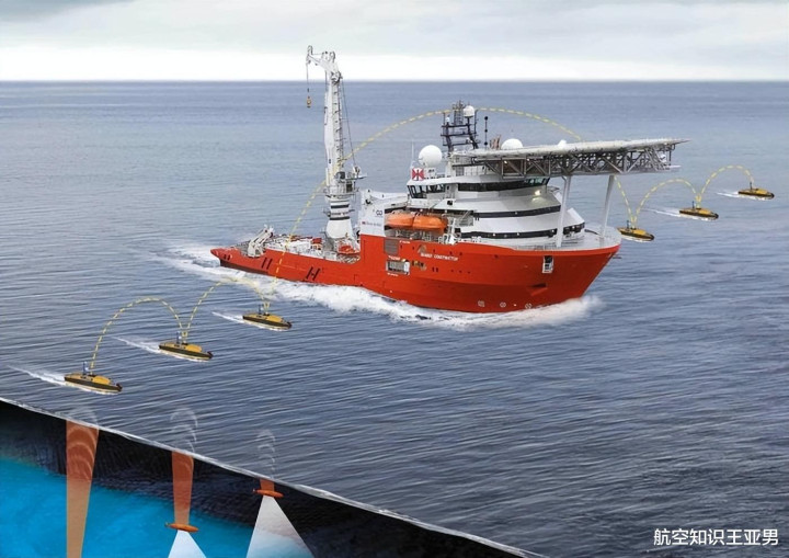 这是一艘作业母船,除了能起重能起降直升机之外,其实它最大的绝招在于,它拥有8艘水下无人潜航器组成的一个工作群。这8艘潜航器,每个可以连续作业50个小时,利用艇侧的声呐对海底进行扫描。